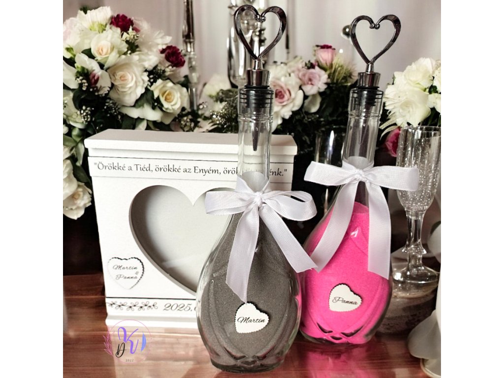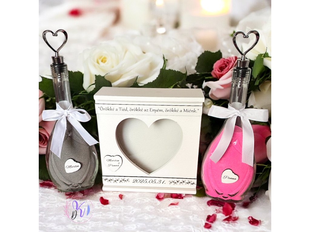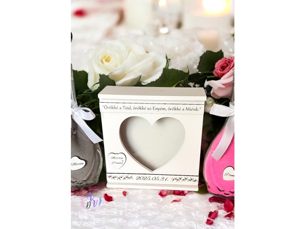 - Doboz gravírozott nevekkel és dátummal díszítve.